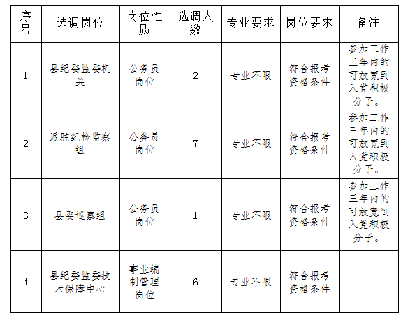 4.资格审查:根据报名条件和要求,县纪委监委负责资格审查,资格审查贯穿公开选调的全过程(含选用后),凡发现考生与选调岗位要求资格条件不符的,取消其选调资格。