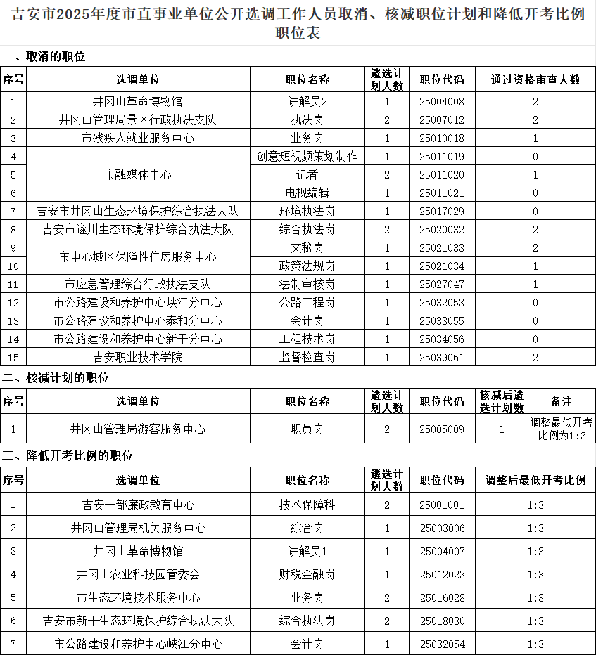 吉安市2025年市直事业单位公开选调工作人员现场报名工作已结束。根据《吉安市2025年市直事业单位公开选调工作人员公告》规定,经商有关选调单位,现将未达到1:5开考比例的职位调整和改报事项公告如下:
