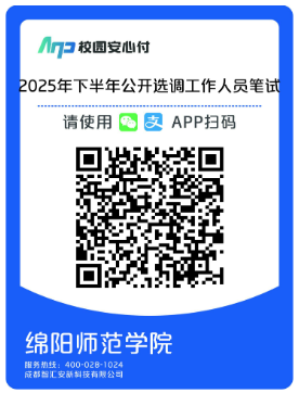 资格初审合格后,由报考人员于2025年12月26日17:00前扫描下方二维码完成网上缴费(按照四川省发展和改革委员会、四川省财政厅《关于全省人力资源社会保障部门行政事业性收费的通知》川发改价格规〔2023〕473号规定笔试1科缴费50元,共50元),缴费成功后,请于2025年12月26日17:00前,将缴费截图(含缴费金额、报考者姓名、身份证号码及报考岗位代码等信息)上传至报名系统进行确认,逾期不再确认。未按要求在规定时间内缴费的或虽缴费但未按要求在规定时间内提供缴费凭证进行缴费确认的,视为自动放弃报考。缴费成功后,非政策性因素,不予退费。