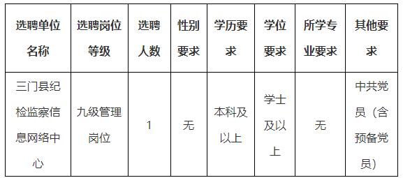 因工作需要,三门县纪委县监委下属事业单位三门县纪检监察信息网络中心决定在全县范围内公开选聘事业编制工作人员1名,为巡察办专编专用。现将有关事项公告如下: