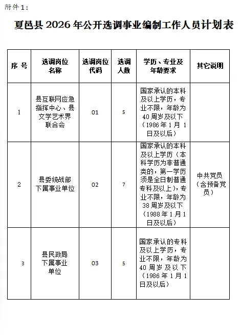 附件 :1夏邑县2026年公开选调事业编制工作人员计划表