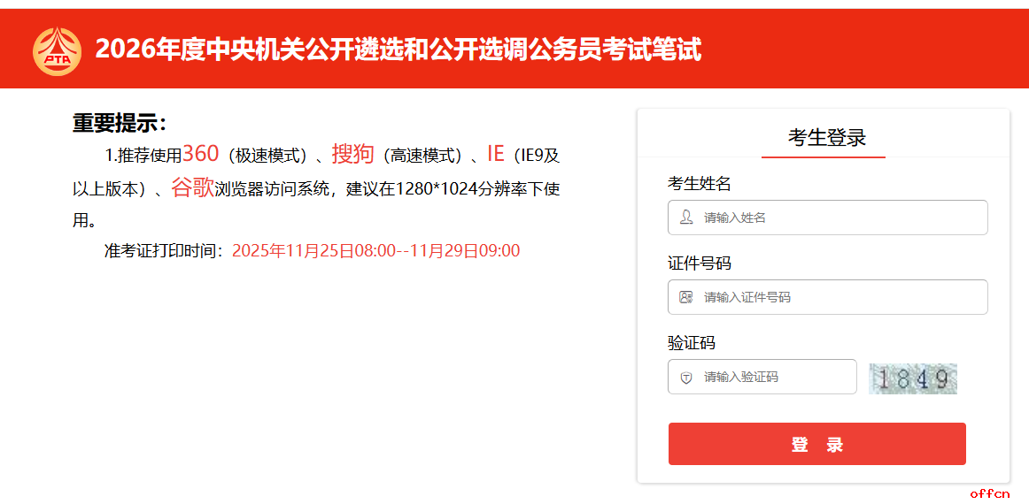 2026年度中央机关公开遴选和公开选调公务员笔试准考证打印时间:2025年11月25日8:00至11月29日9:00,以下是甘肃中公教育为大家整理的准考证打印入口,各位考生可点击下图,一键直达